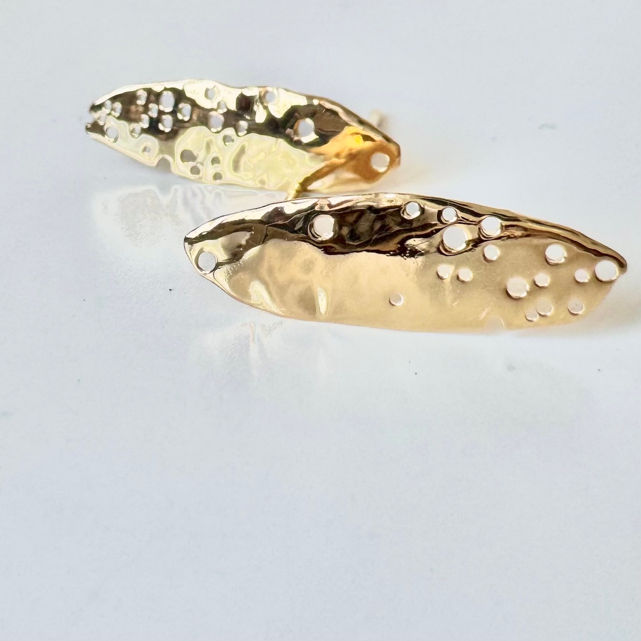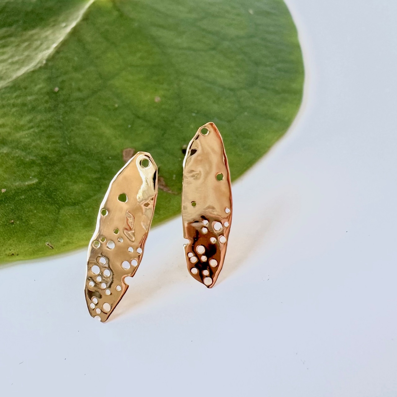 Plaque en forme d’amande martelée et percée à la main pour un relief unique et une parfaite irrégularité.